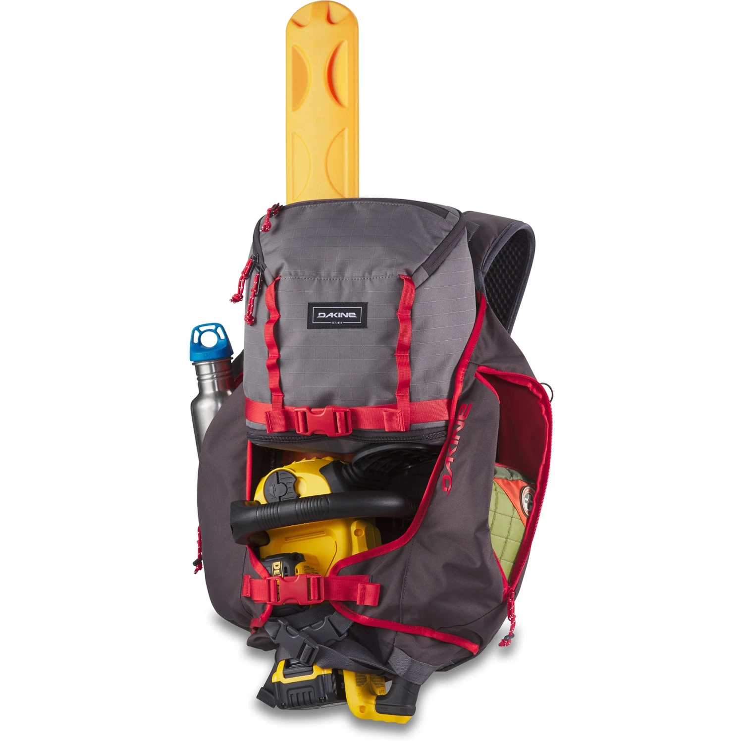 Our ode to the art of trail building, the Builder Pack is a tribute to all the hardy souls who build and maintain trails around the world. Conceived more than 15 years ago with the goal of helping trail builders get into the backcountry with all their tools on two wheels, the Builder Pack has continually been refined through feedback from some of the world’s foremost trail builders—and this smaller, 25-liter version is designed to get you and your tools deep into remote build zones that require extensive pedaling. With ample storage for snacks, gloves, extra clothes and first-aid essentials, the Builder Pack covers the basics, while also allowing for low-center-of-gravity carriage of heavier power tools and a chainsaw. The flatbed chassis with anchors enables the pack to be configured in multiple ways for different body types and tool transport, while external straps cinch down longer tools such as rakes, Pulaskis, McLeods and the trusty 5-gallon bucket. With a sturdy, 30-millimeter waistbelt and a sternum strap with an integrated rescue whistle, weight is kept low and close to the body to give freedom of movement for pedaling. And large, zippered side pockets give storage for fuel, spare batteries and water. The 25-liter Builder Pack carries everything you need to get into the backcountry and rake in that sweet new line.