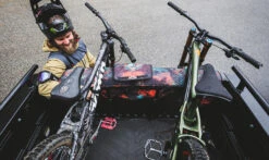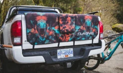 The Dakine Pickup Pad DLXâ„¢ builds on the heritage of the original Pickup Padâ„¢ pioneered by Dakine. Updated DLX features accommodate new backup camera technology via the enlarged access flap and fit modern tailgate styling including wider spoilers. This bike and tailgate protector allows for the quick and secure transport of up to 7 bikes on a large full-size truck and 5 on a small mid-size truck. The lockable grommet in the corner are for securing it to the truck with a cable lock.
