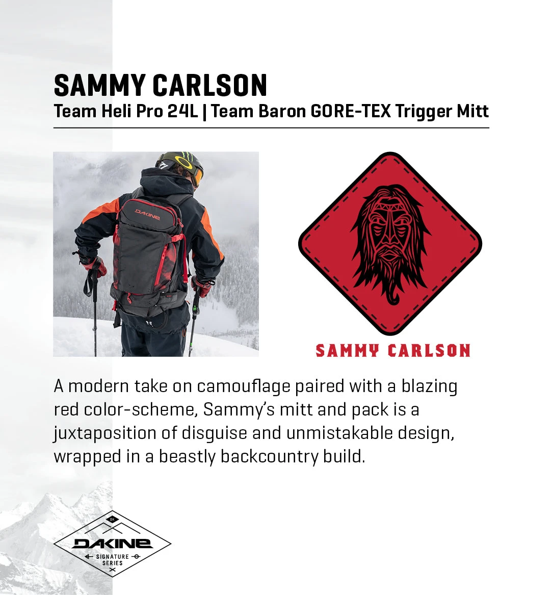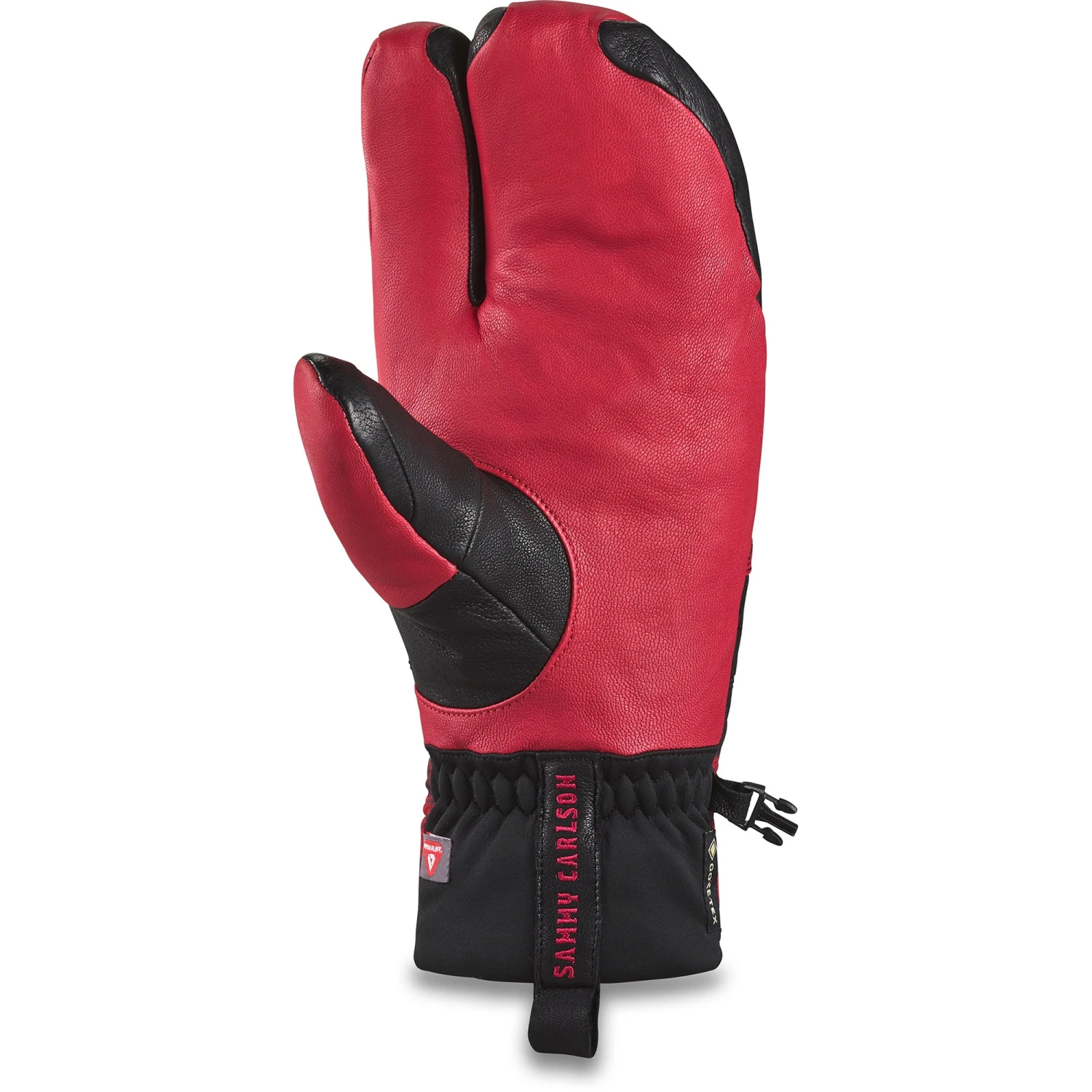 The Team Baron GORE-TEX Trigger Mitt is a premium piece of all-mountain handwear with Sammy Carlson’s signature touch. A modern take on camouflage paired with a blazing red color-scheme, Sammy’s mitt is a juxtaposition of disguise and unmistakable design, wrapped in beastly backcountry build. Its durable dexterity is what Carlson trusts to hang tough when conditions are deep and the missions are deeper.The full-leather mitt features Gore Grip technology meaning the GORE-TEX insert, inner lining and shell material are all bonded together with high strength adhesive tape in key areas for a no-slip build. The result is a close-fitting, single layer feel that provides optimum tactility and dexterity for a sure grip and top-tier storm protection. A soft wool lining combined with Primaloft® Gold means you get an ultra-fine microfiber insulation that provides the highest level of combined warmth, water-resistance, softness and compressibility, delivering all-conditions warmth that can be trusted any day of the season.
